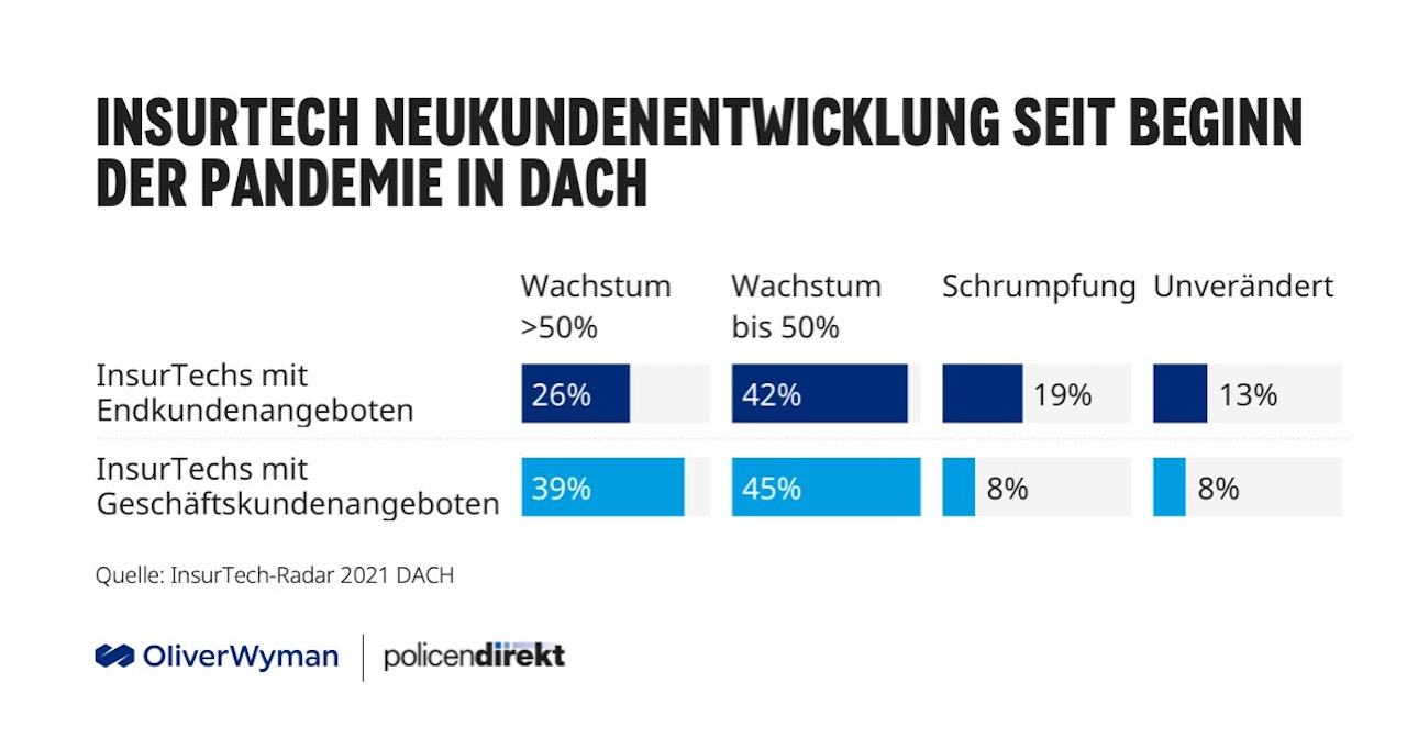 InsurTechs haben sich bisher – trotz Corona-Pandemie – sehr gut gehalten. Im 6. InsurTech-Radar von Oliver Wyman (www.oliverwyman.de) in Zusammenarbeit mit der Maklergruppe Policen Direkt (www.policendirekt.de) jetzt herausgab. Demnach haben beispielsweise über 80 Prozent der InsurTechs während der Pandemie mehr Neukunden gewonnen – über ein Drittel von ihnen sogar mehr als 50 Prozent. Das aktuelle „InsurTech-Radar“ von Oliver Wyman und Policen Direkt hat die Entwicklung der InsurTechs in Deutschland, Österreich und der Schweiz (= DACH-Region) systematisch untersucht. Auf dem Weg zur „Tech-Surance“ sehen die Autoren indes in der DACH-Region noch Lücken im Angebot.