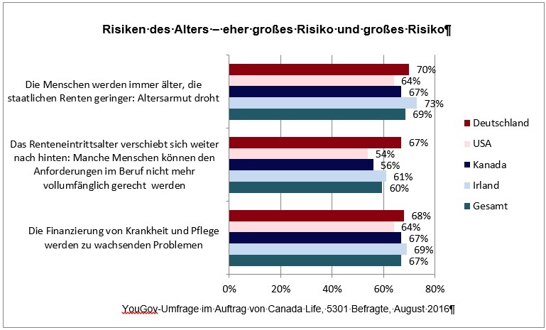 26. September 2016 - Wie ticken Deutsche, Iren, Kanadier und Nordamerikaner? Aufschluss darüber gibt eine neue YouGov-Studie im Auftrag der Canada Life. Erstes Fazit: Überall sorgt sich die Bevölkerung über Terror, Altersarmut, Krankheit und Klimawandel am meisten. Gleichzeitig boomt das Canada-Life-Geschäft.