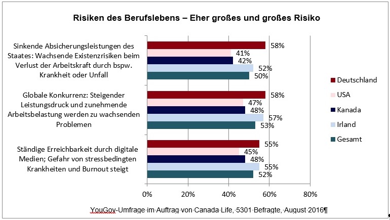 Die Studie brachte weitere realistische Erkenntnisse: Auch wenn es um das Berufsleben geht, überwiegt der Blick auf die Risiken. Mehr als die Hälfte aller Befragten erkennt eher große bis sehr große Risiken durch globale Konkurrenz und einen wachsenden Leistungsdruck (Canada-Life-Grafik – zum Vergrößern bitte anklicken). Besonders hoch ist die Besorgnis in Deutschland, besonders entspannt scheinen die Kanadier. - Auch sinkende Absicherungsleistungen des Staates beim Verlust der Arbeitskraft bergen für die Bundesbürger hohes Risikopotenzial. „Für dieses Risiko sorgen immer mehr unserer Kunden vor: Das Bewusstsein um den finanziellen Wert der eigenen Arbeitskraft scheint in Deutschland weiter zu wachsen“, so Drews.