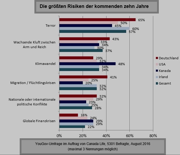 Für insgesamt 57 Prozent der Befragten aller Länder stellt Terror mit Abstand die größte Gefahr der kommenden zehn Jahre dar (Canada-Life-Grafik - zum Vergrößern bitte anklicken). Deutsche sind im Hinblick auf die Terror-Risiken mit 65 Prozent besonders besorgt, Kanadier mit 45 Prozent am wenigsten. Auf Platz zwei der Risiken folgt die Sorge um die wachsende Kluft zwischen Arm und Reich. Besonders in Deutschland wird dieses Problem als sehr groß eingeschätzt: 43 Prozent der Bundesbürger sehen darin ein großes Risiko für die Zukunft, während der Gesamtwert über alle Länder hinweg bei 37 Prozent liegt. Migration und Flüchtlingskrise sind ebenfalls für die Deutschen ein überwiegendes Risiko: Über 40 Prozent der Bundesbürger sehen hier große Gefahren für die Zukunft, die Iren folgen mit nur 32 Prozent. Ein anderes Bild zeigt sich beim Klimawandel: In Kanada ist rund jeder Zweite (48 Prozent) besorgt, wohingegen hierzulande nur 29 Prozent den Klimawandel als großes Zukunftsrisiko einstufen.