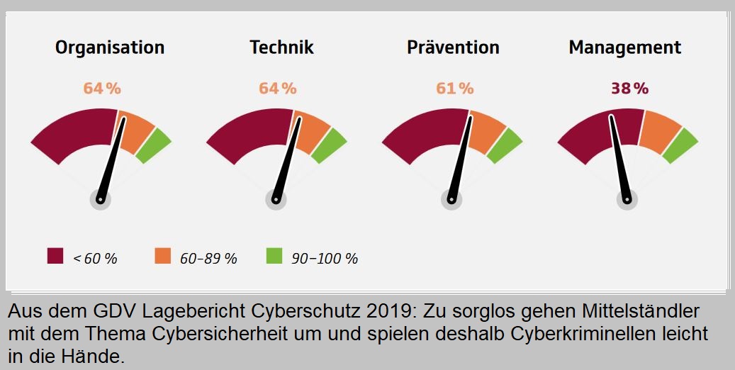 Schließlich wachse bei den Verantwortlichen in kleinen und mittelgroßen Unternehmen (KMU) das Bewusstsein für die Bedeutung der IT-Sicherheit. Allerdings sei immer noch viel Luft nach oben. , wie der „Lagebericht Cyberschutz 2019“ des Gesamtverbandes der Deutschen Versicherungswirtschaft und zeigt.