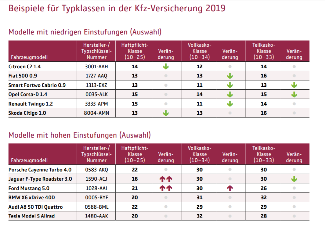 Die GDV-Statistiker betonen, dass in der Kfz-Haftpflichtversicherung sind die Versicherungsleistungen für geschädigte Unfallgegner maßgeblich; dagegen spielt in der Kaskoversicherung auch der Wert des versicherten Autos eine Rolle. Daher haben viele hochmotorisierte Oberklasse-Modelle und SUVs wie etwa der Porsche Cayenne Turbo 4.0 (Typ: 9YA, seit 2017) und der BMW X6 XDrive 40D (Typ: X6, seit 2014) hohe Typklassen, ältere Modelle und Kleinwagen wie der Renault Twingo 1.2 (Typ N, 2007-2014) oder der Skoda Citigo 1.0 (Typ AA, seit 2011) eher niedrige Klassen (siehe auch nebenstehende GDV-Tabellen – zum Vergrößern bitte anklicken).