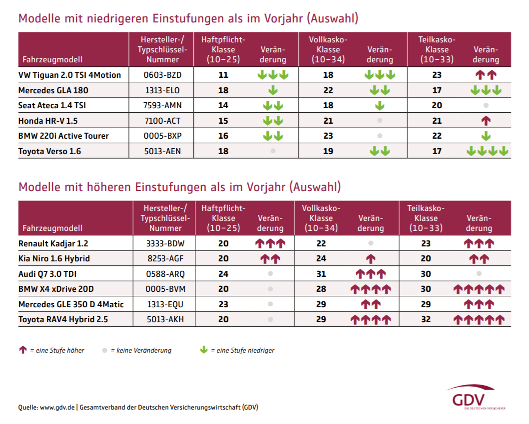 Große Sprünge sind laut GDV die Ausnahme, nur für wenige Modelle geht es um mehr als eine Klasse nach oben oder nach unten. So verbessert sich etwa der VW Tiguan 2.0 TSI 4Motion (Typ 5N, seit 2015) um drei, der Seat Ateca 1.4 TSI (Typ 5FP, seit 2016) um zwei Klassen, während sich der Renault Kadjar 1.2 (Typ RFE, seit 2015) um drei und der Kia Niro 1.6 Hybrid (Typ DE, seit 2016) um zwei Typklassen verschlechtert.