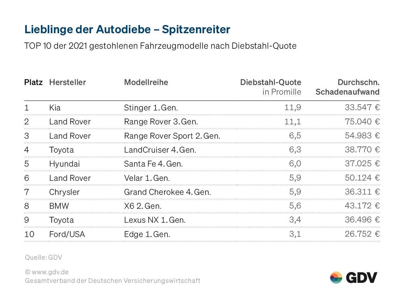 Besonders beliebt bei den Kriminellen bleiben teure Geländewagen: Neun der zehn am häufigsten gestohlenen Modellreihen waren SUVs, darunter gleich drei Modelle von Land Rover. Auch im Herstellervergleich werden Land Rover am häufigsten gestohlen: Mit 177 Fällen kamen auf 1.000 kaskoversicherte Autos dieser Marke 1,7 Diebstähle.