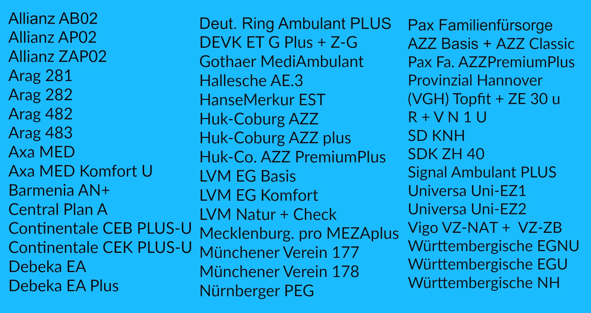 Finanztest hat 59 dieser privaten ErgänzungsTarife geprüft, die mindestens Heilpraktikerleistungen oder NaturheilVerfahren durch Ärzte bezuschussen. Die Versicherungspakete steuern häufig auch etwas für Brillen, Zahnersatz und weitere Gesundheitsleistungen bei. Das sind zum Beispiel Auslandsreise-Krankenschutz, Zuschüsse zu Reiseimpfungen oder Vorsorgeuntersuchungen, die gesetzlich Versicherte sonst teilweise selbst zahlen müssten wie zum Beispiel zusätzliche KrebsfrüherkennungsUntersuchungen.