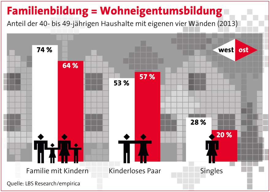 Bei kinderlosen Paaren im Alter zwischen 40 und 49 Jahren liege die Wohneigentums-Quote in Ost und West ebenfalls auf relativ hohem Niveau: In den neuen Ländern erreiche sie 57 Prozent, im Westen 53 Prozent. Bei den Alleinerziehenden liege die Wohneigentums-Quote in Ost und West bei rund einem Viertel.