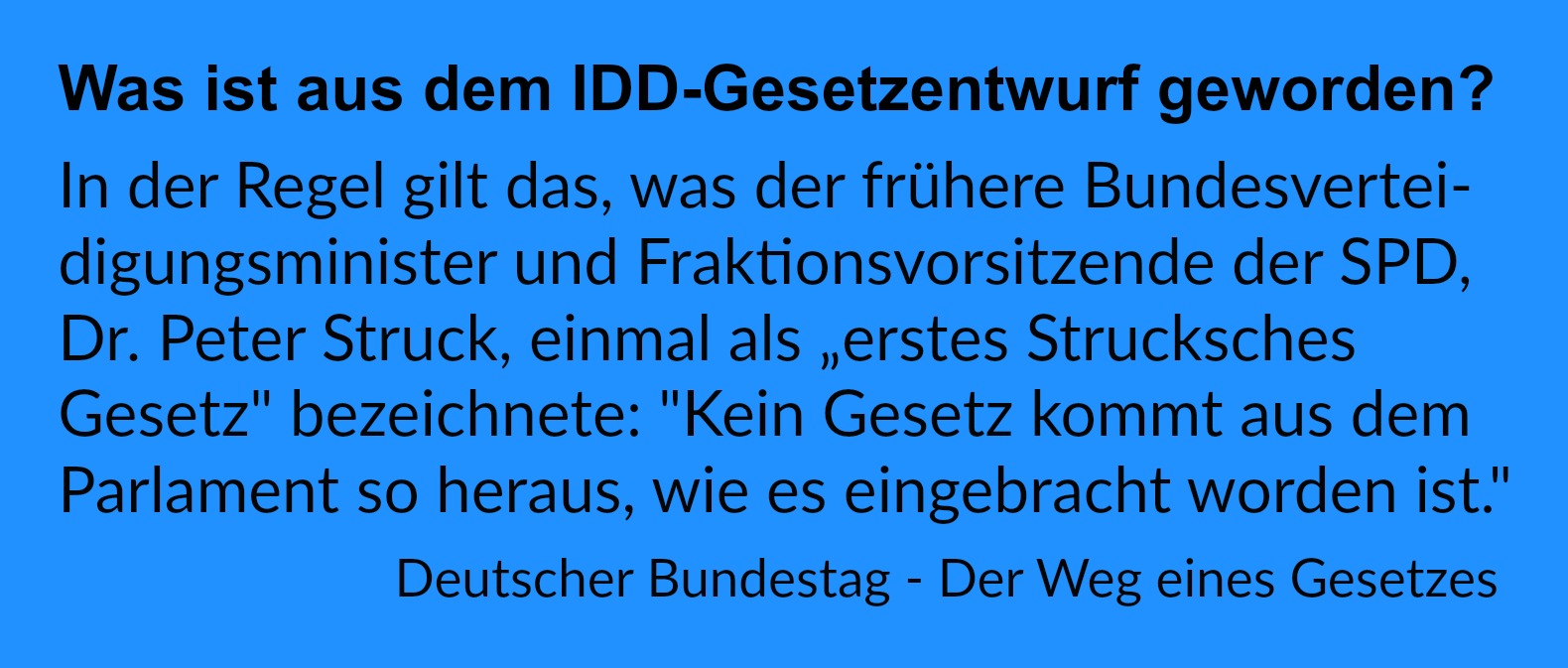 26. Juni 2017 - Kein Gesetz kommt so raus, wie es ins Gesetz-gebungsverfahren reingegangen ist, besagt das Strucksche Gesetz. Das wird sich in zwei Tagen bei der abschließenden Lesung im Bundestag zur Umsetzung der Vertriebsrichtlinie IDD wieder bestätigen – zur Freude der Makler, die ihre Zwitterstellung wohl behalten.