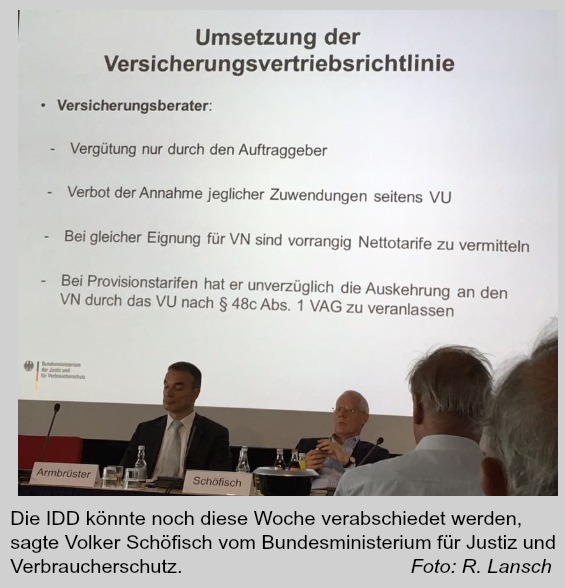 Beratungen im Bundestag nun, wie geplant am 29. und 30. Juni stattfinden, könnte die IDD „auf den letzten Drücker“, wie Volker Schöfisch, Ministerialdirektor im Bundesministerium für Justiz und Verbraucherschutz (BMJV) sagte, am 7. Juli verabschiedet werden. Die Richtlinie bewirkt im Wesentlichen Änderungen im Versicherungsaufsichtsgesetz (VAG) und im Versicherungsvertriebsgesetz (VVG). Dabei sind bis zuletzt zahlreiche Änderungen an den Änderungen vorgenommen worden, nicht allein die Maklerhonorierung.