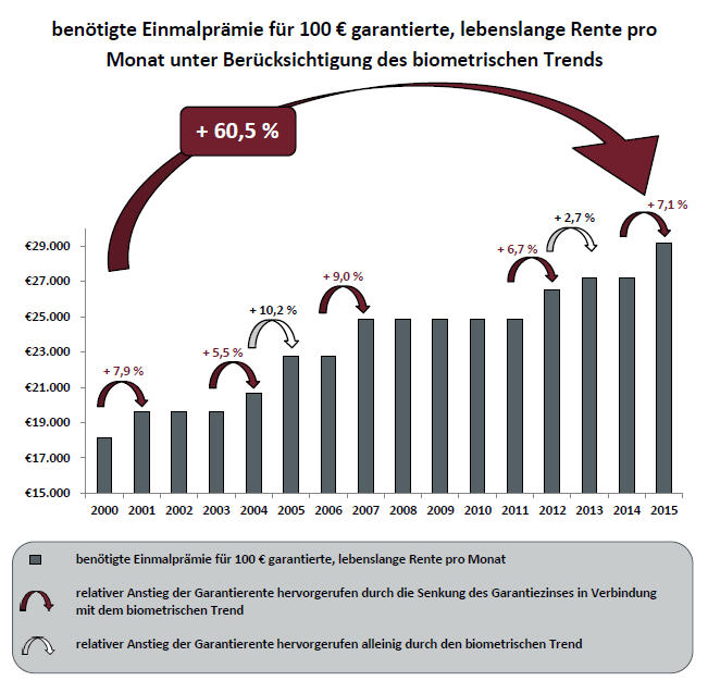 Die Studie identifiziert zwei verschiedene Ursachen für den Anstieg: Das ist zum einen die Absenkung des Rechnungszinses, der vom Verlauf der Kapitalmarktzinsen abhängt. Da diese seit der Finanzmarktkrise im Jahr 2007 erheblich gesunken sind, wurde der Rechnungszins in mehreren Schritten bekanntlich bis auf 1,25 Prozent abgesenkt. Zum anderen führten aber auch biometrische Trends, wie die Einführung der Unisex-Tarife und die Erhöhung der Lebenserwartung, zu einer Verteuerung der Garantien.