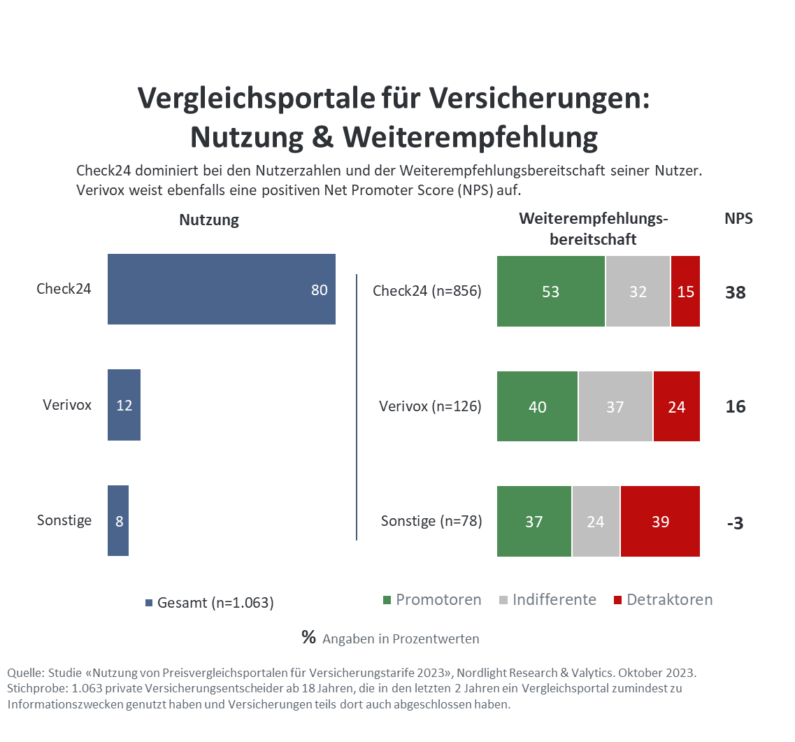 Weiterempfehler, Passive und Detraktoren / Kritiker – nennen sich die Portal-Kunden. Angesteuert werden die Vergleichs-Portale für Versicherungs-Tarife von ihren Nutzern überwiegend direkt (beispielsweise über Eingabe der Internetadresse im Browser); vergleichsweise seltener über Links auf anderen besuchten Internetseiten (Suchmaschinen, Themenseiten etc.).