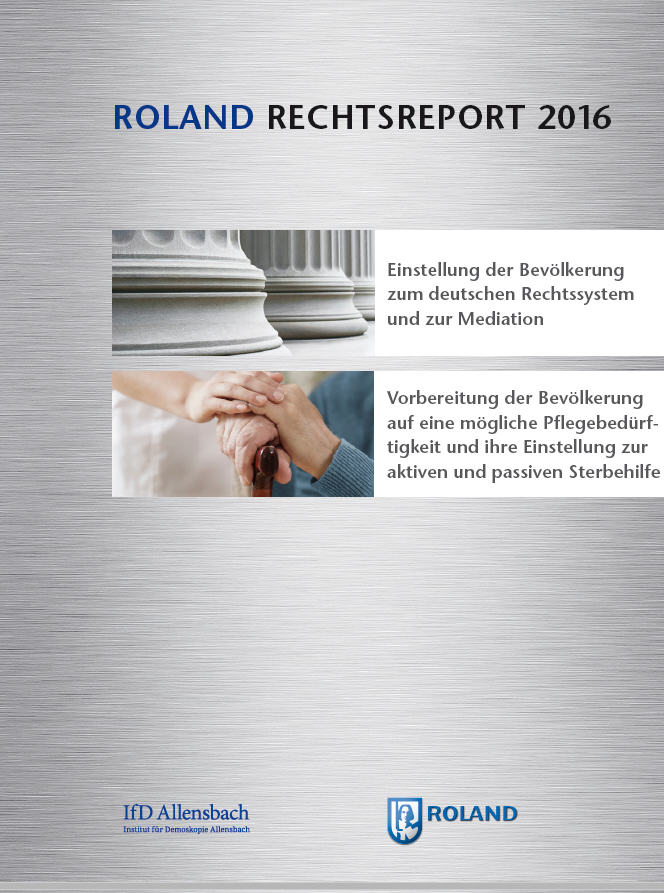 Dies sind die wichtigsten Ergebnis des diesjährigen Rechtsreports der Roland Rechtsschutzversicherung AG (www.roland-konzern.de), der in Zusammenarbeit mit dem Institut für Demoskopie Allensbach (www.ifd-allensbach.de) erstellt wurde. Untersucht wird die Einstellung der Bevölkerung zum deutschen Rechtssystem und zur Mediation. 2016 wurde zudem beleuchtet, inwieweit sich die Deutschen auf eine mögliche Pflegebedürftigkeit vorbereiten und wie sie zum Thema Sterbehilfe stehen.