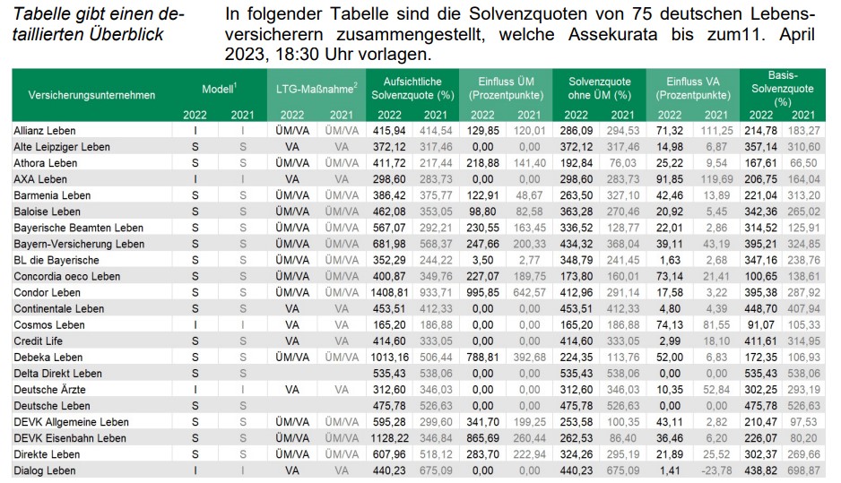 Unter www.solvencydata.com/ticker findet man die kontinuierlich erfassten Solvenz-Quoten tabellarisch zusammengestellt. Neben den Lebensversicherern werden dort auch die privaten Krankenversicherer sowie die Schaden-/Unfall- und Rückversicherer aufgeführt.