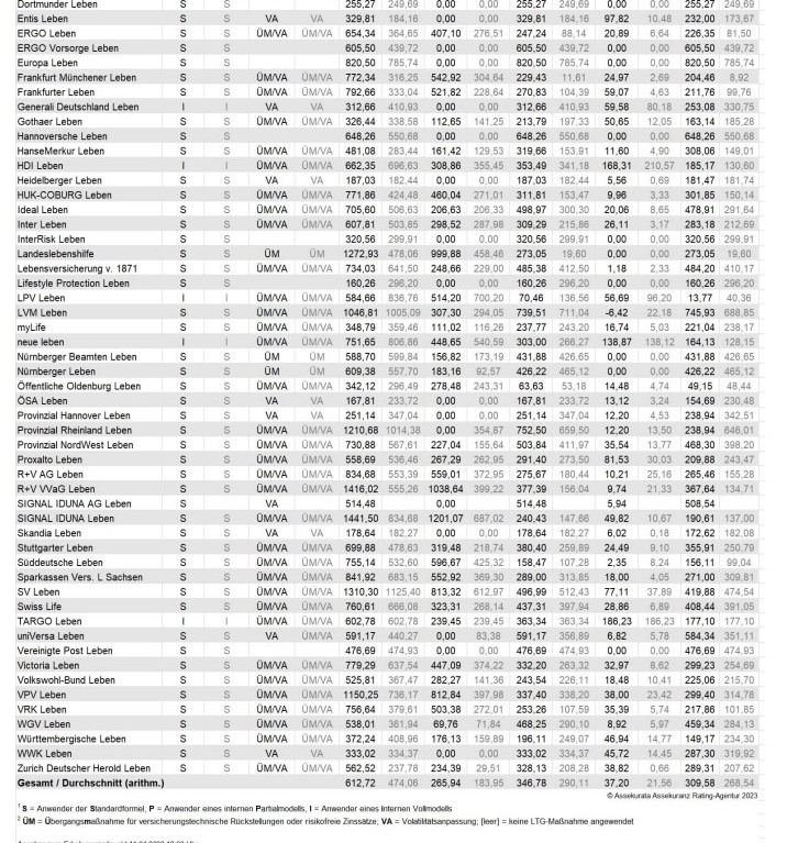 „Der rapide Zinsanstieg hat zu völlig neuen Rahmenbedingungen auf den Finanzmärkten geführt“, kommentiert Lars Heermann, Bereichsleiter Analyse und Bewertung bei der Versicherungs-Ratingagentur Assekurata. „Insbesondere die Solvenz-Quoten von Lebensversicherern, die im Schnitt um 139 Prozentpunkte gestiegen sind, profitieren von den gestiegenen Marktzinsen.“ So belief sich zum 31. Dezember 2022 die aufsichtliche Solvenz-Quote nach bisherigen Erhebungen von Assekurata auf durchschnittlich 613 Prozent. Im Vorjahr hatte die Quote bei den in der Tabelle erfassten Versicherern bei durchschnittlich 474 Prozent gelegen.