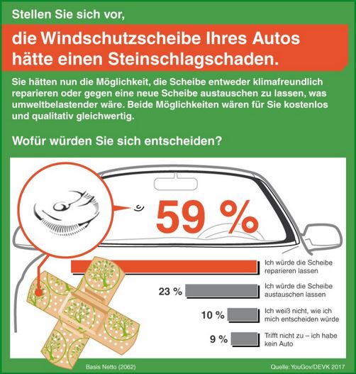 Ist die Frontscheibe durch Steinschlag beschädigt, gibt es zwei Möglichkeiten: Man kann die Scheibe reparieren oder austauschen lassen. Umweltfreundlicher ist die Reparatur, denn sie spart rund 75 Prozent CO2 gegenüber dem Austausch. Aber überzeugt das auch deutsche Autofahrer? Eine repräsentative Umfrage der YouGov-Marktforscher (www.yougov.de) im Auftrag der Devk Versicherungen zeigt: 59 Prozent der Befragten würden einen Steinschlagschaden in der Windschutzscheibe lieber klimafreundlich reparieren lassen, als die Scheibe auszutauschen. Nur 23 Prozent der Fahrzeugbesitzer würden trotzdem den Austausch bevorzugen – vorausgesetzt, beide Verfahren wären qualitativ gleichwertig und für den Versicherten kostenlos (siehe Devk-Grafik – zum Vergrößern bitte anklicken).