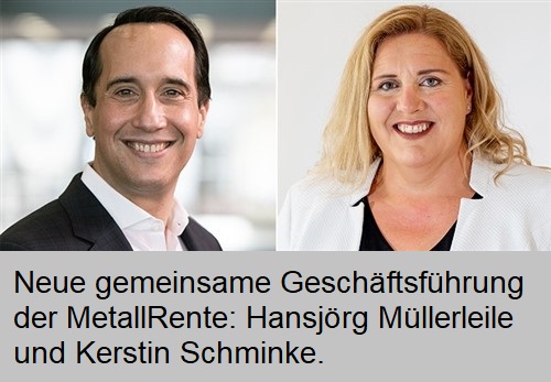 Ab 2022 übernehmen C Müllerleile und Kerstin Schminke gemeinschaftlich die Führung des Versorgungswerks MetallRente (www.metallrente.de). Sie folgen auf Heribert Karch, der die Geschäftsführung seit Gründung der Einrichtung innehatte und Ende 2021 in den Ruhestand geht.