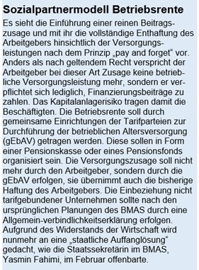 Geht es nach der Koalitionsvereinbarung, muss die Regierung noch in dieser Legislaturperiode eine Reform der betrieblichen Altersversorgung (bAV) auf den Weg bringen, die insbesondere die Durchdringung in kleinen und mittleren Unternehmen (KMU) deutlich voranbringen soll. Dazu liegt bisher der Vorschlag aus dem Hause des Bundesministeriums für Arbeit und Soziales (BMAS – www.bmas.de) zum „Sozialpartnermodell Betriebsrente vor“, nach der zuständigen Ministerin auch „Nahles-Rente“ genannt.